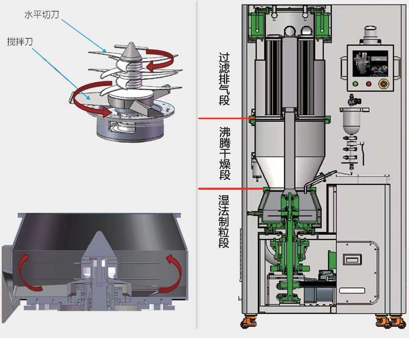 下部濕法制粒采用了AKITA專利技術(shù)的水平剪切式濕法制粒。貼近缸底的攪拌刀中低速旋轉(zhuǎn),將物料向上翻起。上部水平式旋翼切刀高速順時(shí)針旋轉(zhuǎn),將物料混合分散。液體粘合劑用噴槍噴入,高速旋轉(zhuǎn)的水平切刀可以迅速將物料與水分分散結(jié)合,在極短的時(shí)間內(nèi)形成大量的顆粒內(nèi)核。形成內(nèi)核后刀片速度降低,使物料不斷在缸體底部、側(cè)壁、攪拌刀、切刀的表面進(jìn)行滾動(dòng),吸足水分的內(nèi)核會(huì)不斷滾動(dòng)粘結(jié)微粉顆粒,不斷長大直至形成客戶需要的粒徑范圍內(nèi)的球狀顆粒。