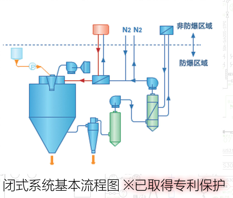 AKITA自主研發(fā)的CSD系列氮?dú)獗Wo(hù)閉式循環(huán)噴霧干燥機(jī),在傳統(tǒng)開放式噴霧干燥基礎(chǔ)上,將整個干燥流程改為封閉循環(huán)系統(tǒng),同時整個系統(tǒng)里面充滿氮?dú)猓m合有機(jī)溶劑或易氧化物料的干燥。同時整套設(shè)備采用了防爆設(shè)計,避免了干燥過程中爆炸風(fēng)險。
